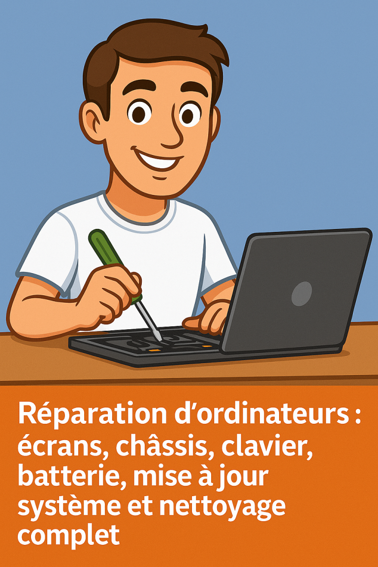 PC portables toutes marques : remplacement d’écran, de châssis ou de clavier, changement de batterie, nettoyage complet et mise à jour du système. Diagnostic rapide et devis avant réparation.